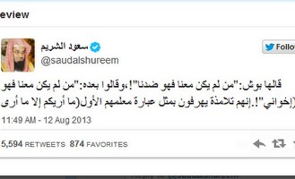وقال الشريم، في تغريدات متتابعة على حسابه بموقع التواصل الاجتماعي العالمي (تويتر) مساء الإثنين 12 أغسطس 2013 :"لطف الناصح للناس أعظم نفعاً من قوة حجته، فالنبي أقوى الناس حجة، وقد قال له ربه (فبما رحمة من الله لنت لهم ولو كنت فظاً غليظ القلب لانفضوا من حولك)"، مضيفاً: "قالها بوش: "من لم يكن معنا فهو ضدنا"!، وقالوا بعده: "من لم يكن معنا فهو إخواني"!. إنهم تلامذة يهرفون بمثل عبارة معلمهم الأول (ما أريكم إلا ما أرى).