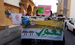 شبكة تابناك الإخبارية : خرج المتظاهرون في بلدات توبلي والسنابس والمعامير وكرزكان وغيرها من المدن للتأكيد على المشاركة الواسعة في الاستفتاء الشعبي، واطلاق اكبر "نعم" لتقرير المصير، مؤكدين رفضهم لانتخابات النظام الحاكم الصورية.