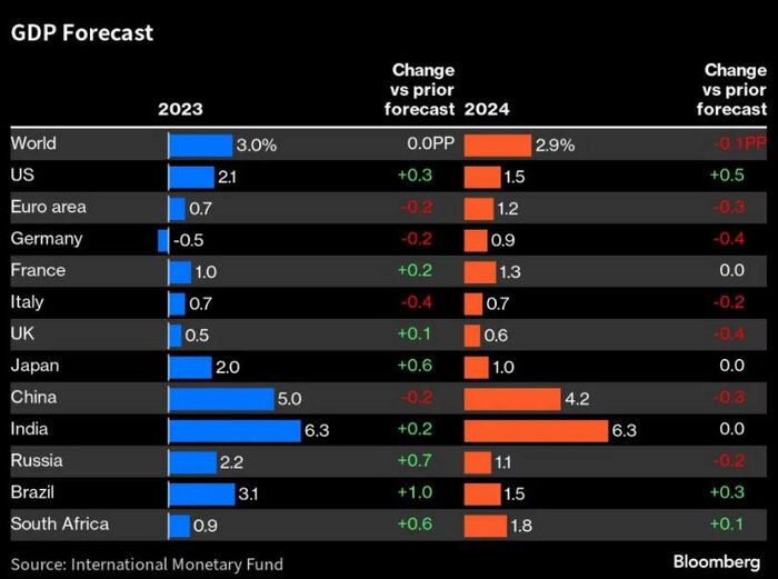 همچنین صندوق بین‌المللی پول پیش‌بینی می‌کند که اقتصاد چین که دومین اقتصاد بزرگ جهان است، امسال پنج درصد و در سال ۲۰۲۴ نیز ۴.۲ درصد رشد خواهد کرد که این میزان نسبت به پیش‌بینی ماه جولای این صندوق کمتر است.