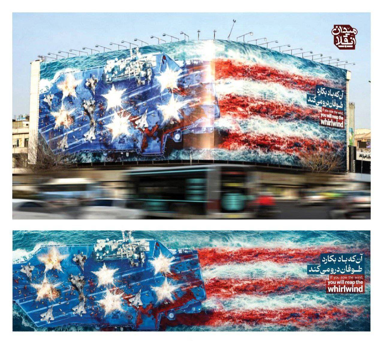همزمان لشکرکشی جدید آمریکا به منطقه غرب آسیا از جدیدترین طرح دیوارنگاره میدان انقلاب تهران با شعار «هرکه باد بکارد طوفان درو می‌کند» با نمایش انهدام ناو هواپیمابر ایالات متحده رونمایی شد.