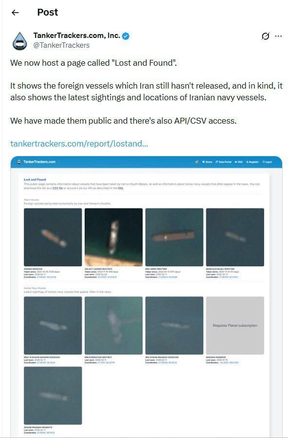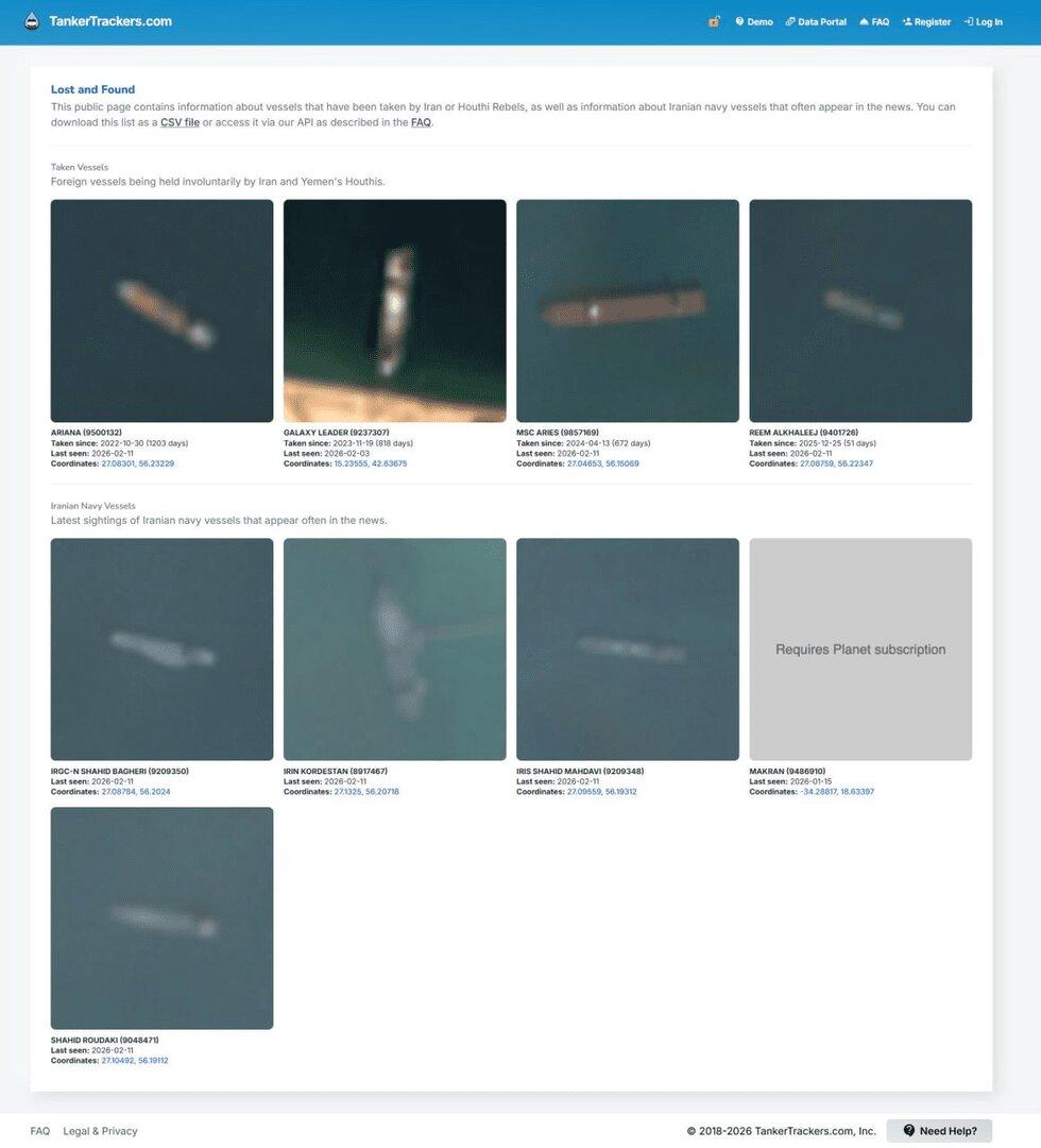 این صفحه، کشتی‌های خارجی را که ایران هنوز آزاد نکرده است، نشان می‌دهد؛ به همین ترتیب، آخرین مشاهدات و موقعیت‌های کشتی‌های نیروی دریایی ایران نیز قابل مشاهده است. ما آن‌ها را عمومی کرده‌ایم و همچنین دسترسی از طریق API و فایل CSV نیز فراهم است.