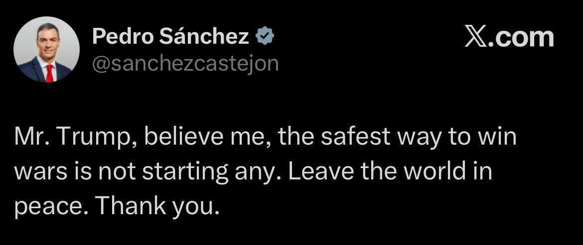 پدرو سانچز، نخست وزیر اسپانیا خطاب به ترامپ در شبکه اجتماعی ایکس نوشت: