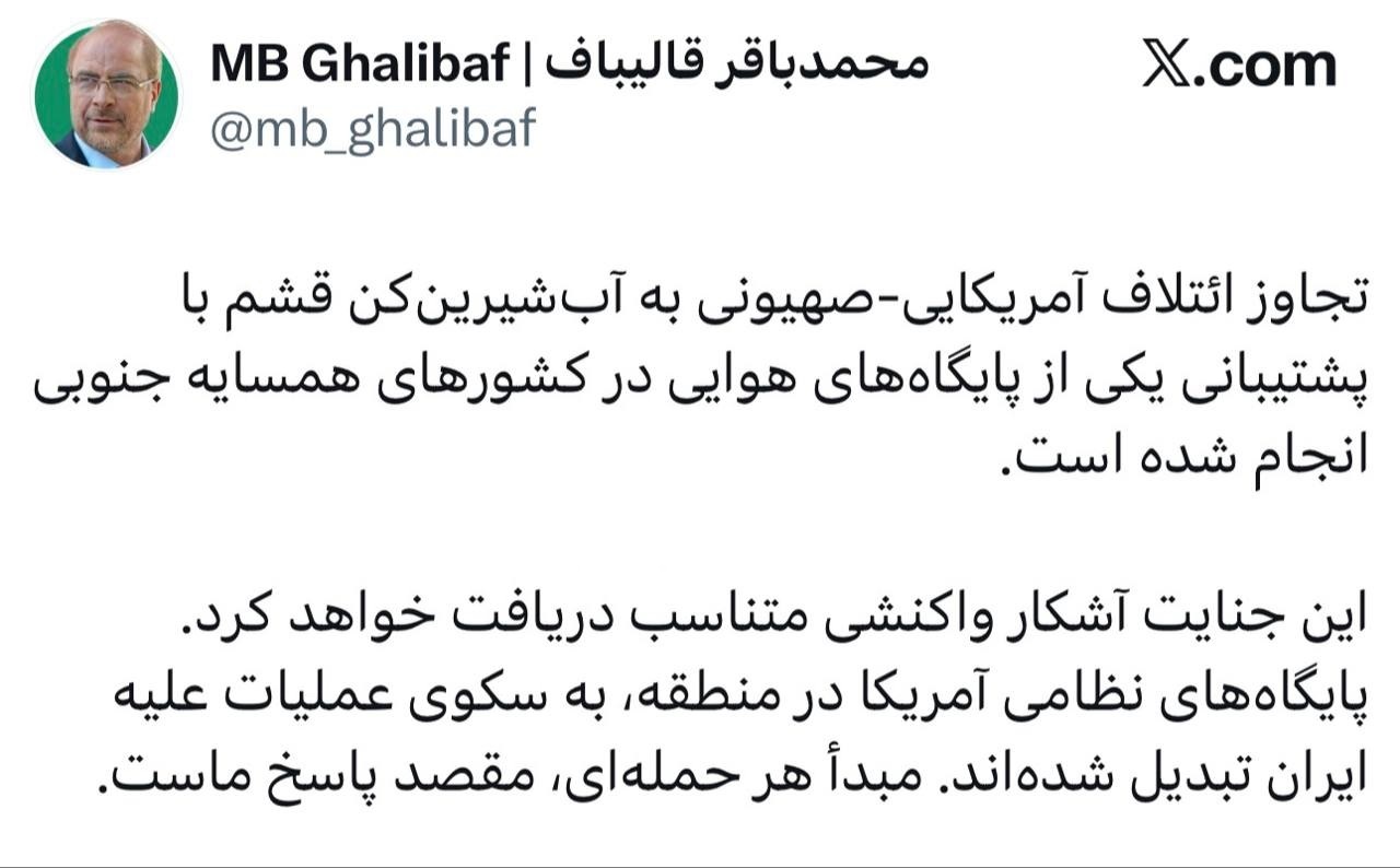 قالیباف افزود: این جنایت آشکار واکنشی متناسب دریافت خواهد کرد. پایگاههای نظامی آمریکا در منطقه، به سکوی عملیات علیه ایران تبدیل شدهاند. مبدأ هر حملهای، مقصد پاسخ ماست.
