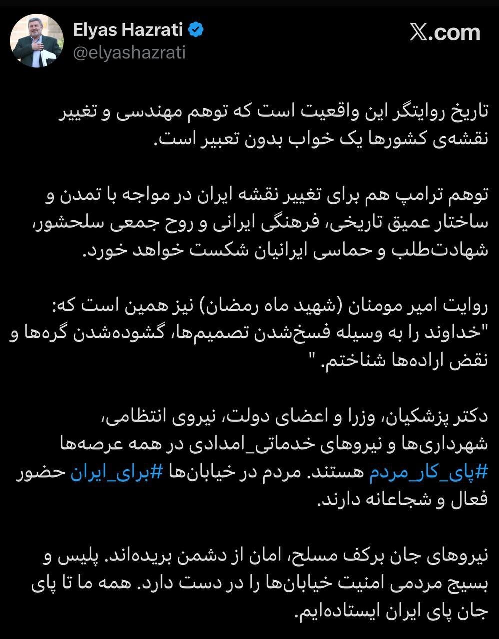 به گزارش تابناک، الیاس حضرتی، رئیس شورای اطلاعرسانی دولت امروز چهارشنبه (۲۰ اسفندماه) در شبکه ایکس نوشت: تاریخ روایتگر این واقعیت است که توهم مهندسی و تغییر نقشهی کشورها یک خواب بدون تعبیر است.