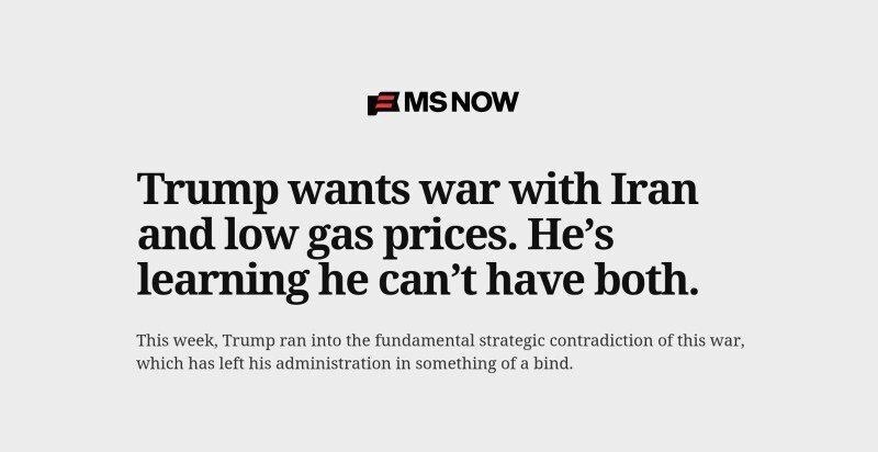 به گزارش تابناک؛ شبکه MSNBC آمریکا در باره تحولات جهانی اخیر و جنگ بین ایران و آمریکا نوشته است: ترامپ فهمیده که نمی‌توان همزمان هم جنگید و هم قیمت‌ها را پایین آورد.