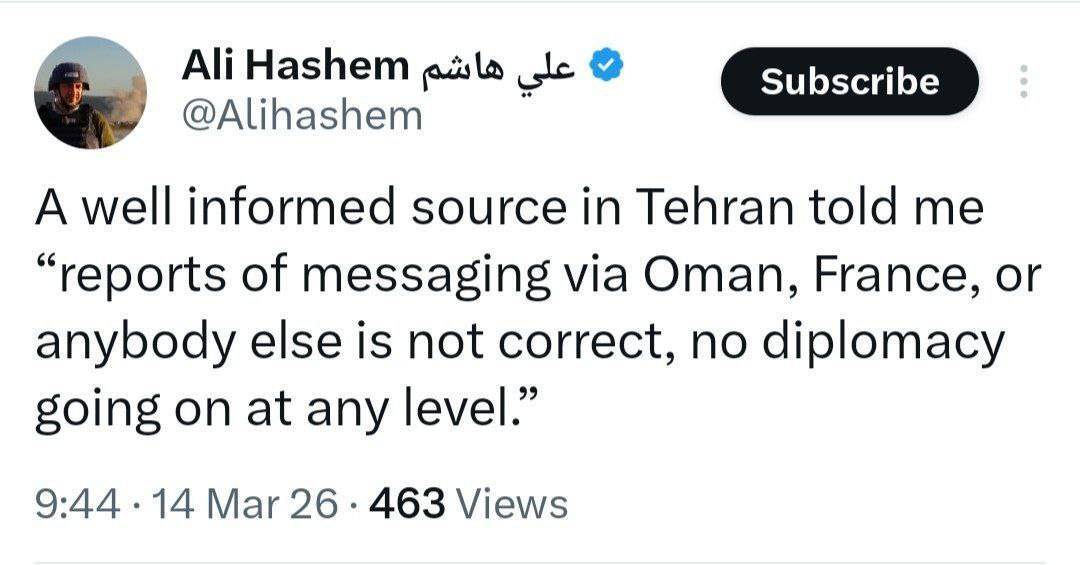 یک منبع آگاه در تهران به من گفت گزارشها مبنی بر ارسال پیام از طریق عمان، فرانسه یا هر کس دیگری صحیح نیست، هیچ دیپلماسی در هیچ سطحی در جریان نیست.