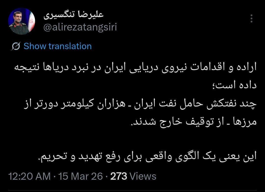 سردار تنگسیری فرمانده نیرودریایی سپاه پاسداران گفت: با اراده نیروی دریایی ایران، چند نفتکش حامل نفت ایران هزاران کیلومتر دورتر از مرزها از توقیف خارج شدند.