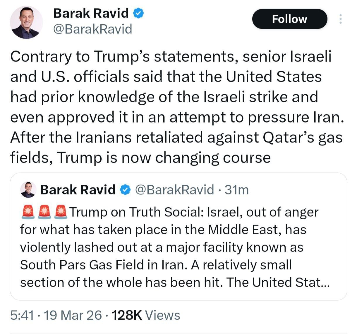 به گزارش تابناک؛ باراک راوید خبرنگار آکسیوس در توییتی نوشت: برخلاف اظهارات ترامپ، مقامات ارشد اسرائیلی و آمریکایی اعلام کردند که ایالات متحده آگاهی قبلی از حمله اسرائیل داشته و حتی با هدف فشار بر ایران، با آن موافقت کرده بود.