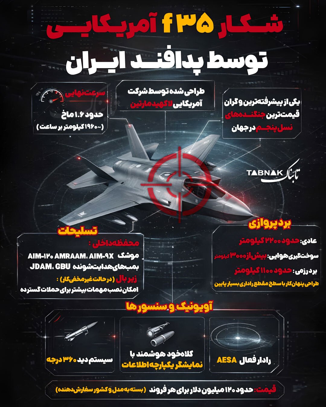 در اینفوگرافیک زیر، تابناک جنگنده راهبردی F35 آمریکا که توسط پدافند سپاه در آسمان ایران هدف قرار گرفت را مورد بررسی قرار داده است.
