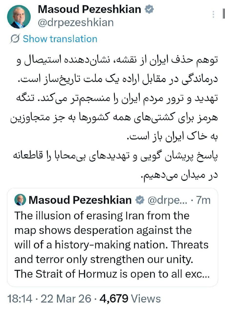 به گزارش تابناک؛ مسعود پزشکیان در واکنش به تهدیدات دونالد ترامپ رئیسجمهوری آمریکا در حساب کاربری خود در شبکه اجتماعی ایکس نوشت: «توهم حذف ایران از نقشه، نشاندهنده استیصال و درماندگی در مقابل اراده یک ملت تاریخساز است. تهدید و ترور مردم ایران را منسجمتر میکند. تنگه هرمز برای کشتیهای همه کشورها به جز متجاوزین به خاک ایران باز است. پاسخ پریشان گویی و تهدیدهای بیمحابا را قاطعانه در میدان میدهیم.»