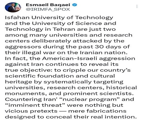 به گزارش ایسنا، اسماعیل بقایی در پیامی در شبکه ایکس با اشاره به جنایات متجاوزان آمریکایی-اسرائیلی در حمله به دانشگاه‌ها و مراکز علمی و پژوهشی، از جمله دانشگاه علم و صنعت و دانشگاه صنعتی اصفهان، نوشت: «دانشگاه صنعتی اصفهان و دانشگاه علم و صنعت تهران، تنها دو مورد از ده‌ها دانشگاه و مرکز پژوهشی هستند که طی ۳۰ روز گذشته در جریان جنگ غیرقانونی متجاوزان علیه ملت ایران، مورد حمله قرار گرفته‌اند.