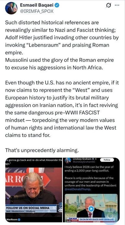 سخنگوی وزارت خارجه: ارجاعات مقامات و نظریهپردازان آمریکایی برای توجیه جنگ غیرقانونی علیه ایران، یادآور افکار فاشیستی هیتلر است