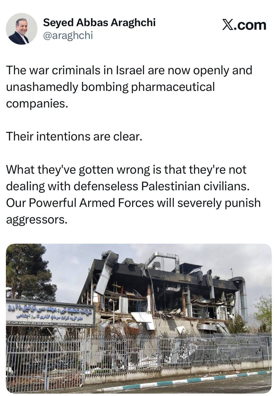 واکنش عراقچی به بمباران شرکتهای داروسازی توسط اسرائیل