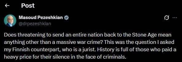 آیا تهدید به بازگرداندن یک ملت کامل به عصر حجر چیزی جز یک جنایت جنگی عظیم معنا دارد؟ این سوالی بود که از همتای فنلاندیام که حقوقدان است پرسیدم.