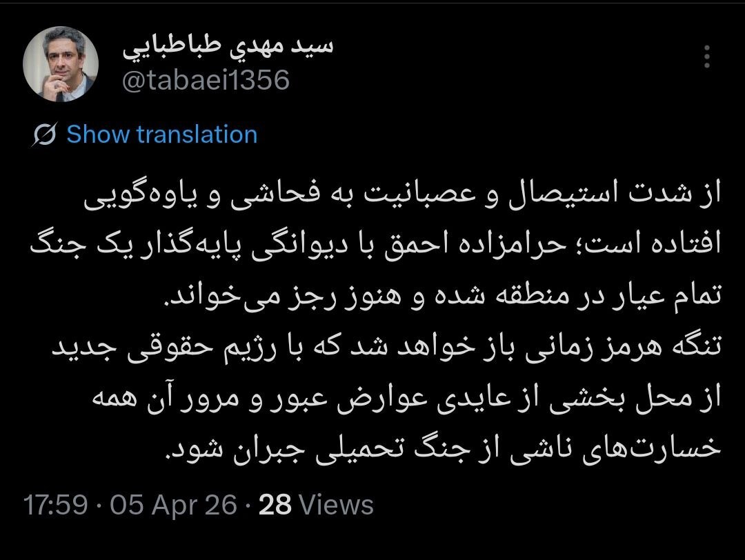 از شدت استیصال و عصبانیت به فحاشی و یاوهگویی افتاده است؛ حرامزاده احمق با دیوانگی پایهگذار یک جنگ تمام عیار در منطقه شده و هنوز رجز میخواند.
