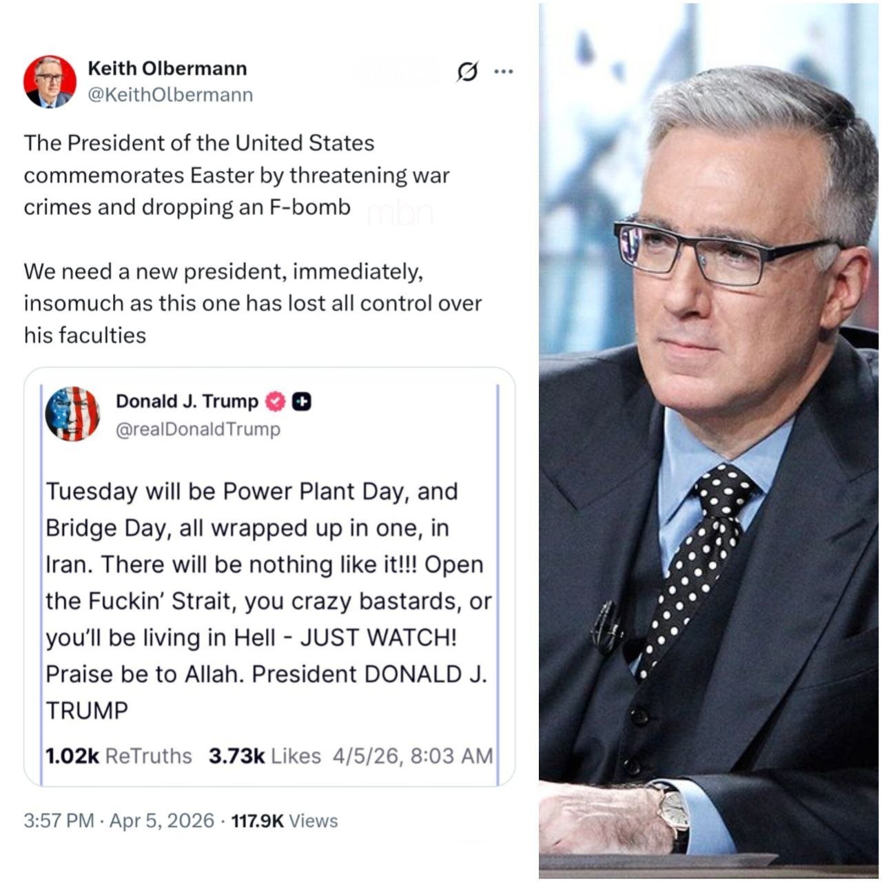 به گزارش تابناک به نقل از نورنیوز؛ کیت اولبرمن مجری مشهور شبکه سراسری ام‌اس‌ان‌بی‌سی آمریکا درباره ترامپ گفت: رئیس جمهور ایالات متحده عید پاک را با تهدید به جنایات جنگی و انداختن یک بمب لعنتی گرامی داشت. ما فوراً به یک رئیس جمهور جدید نیاز داریم، زیرا این یکی تمام کنترل قوای ذهنی خود را از دست داده است.