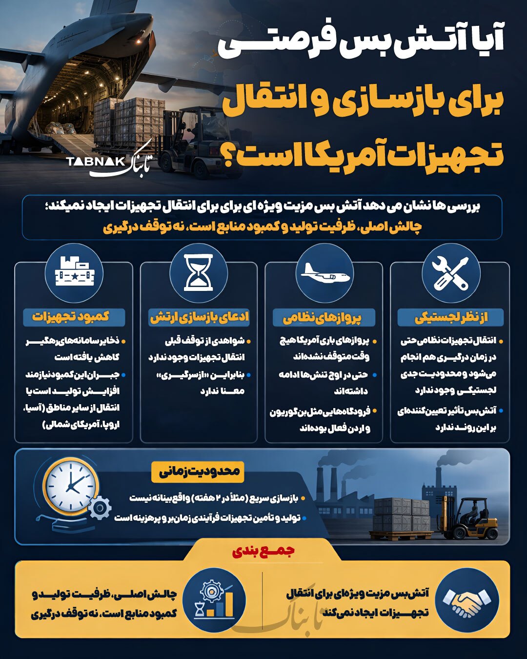 در اینفوگرافیک زیر، تابناک چالش آمریکا برای بازسازی و انتقال تجهیزات در فرصت آتش بس دو هفتهای با ایران را بررسی میکند.