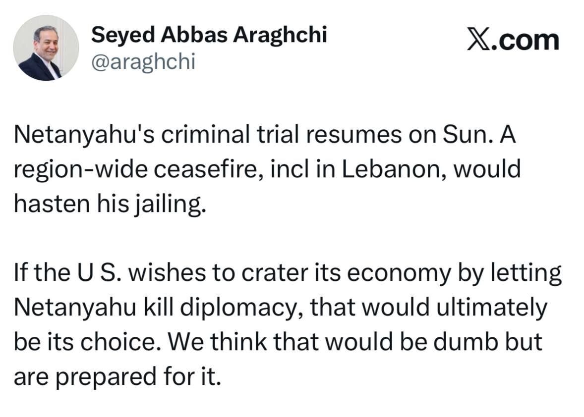 به گزارش تابناک؛ عباس عراقچی وزیر امورخارجه در صفحه شخصی خود نوشت: محاکمه کیفری بنیامین نتانیاهو روز یکشنبه از سر گرفته میشود. برقراری یک آتشبس فراگیر در سراسر منطقه، از جمله در لبنان، میتواند روند زندانی شدن او را تسریع کند.
