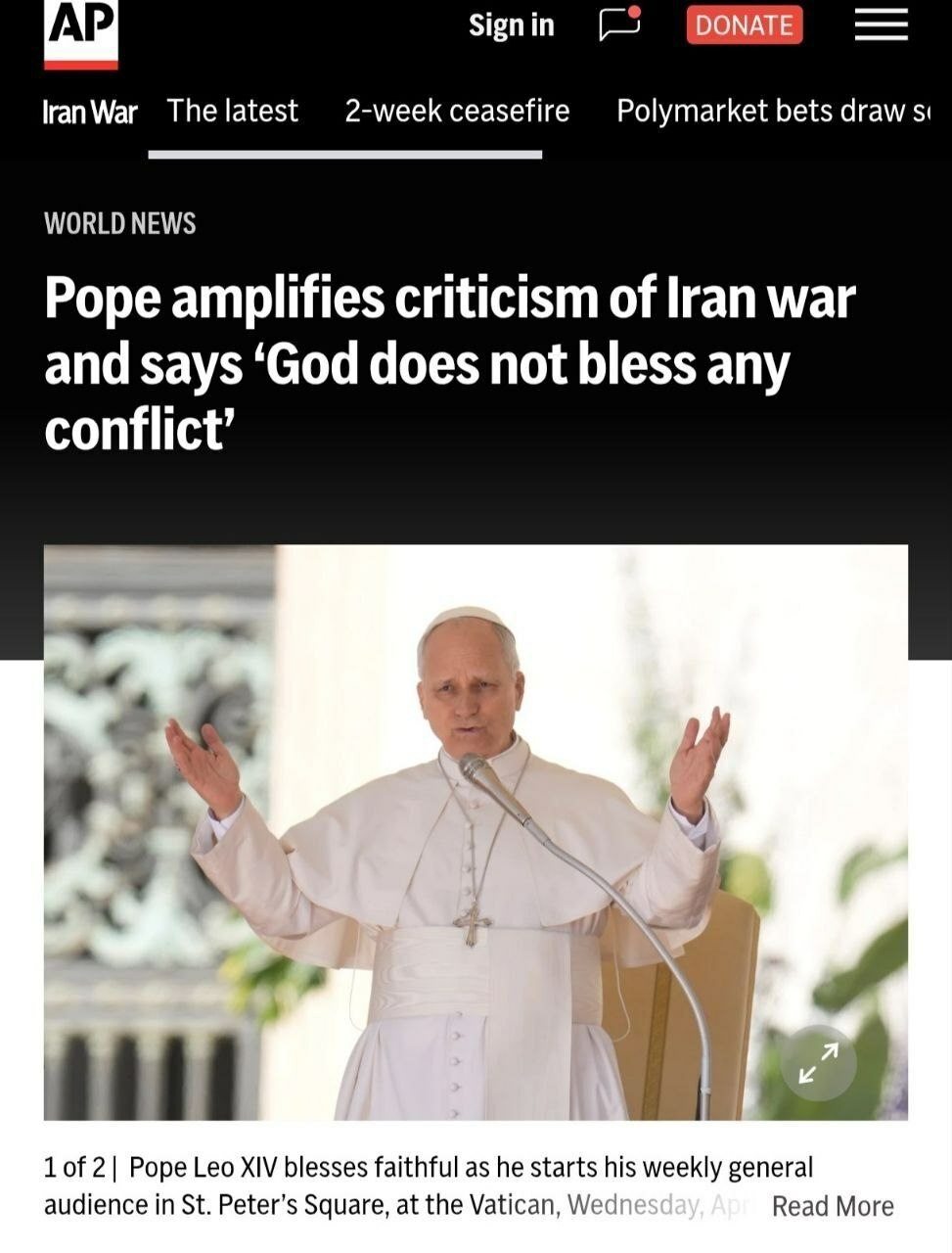 انتقاد پاپ از سران آمریکا به خاطر جنگ علیه ایران
