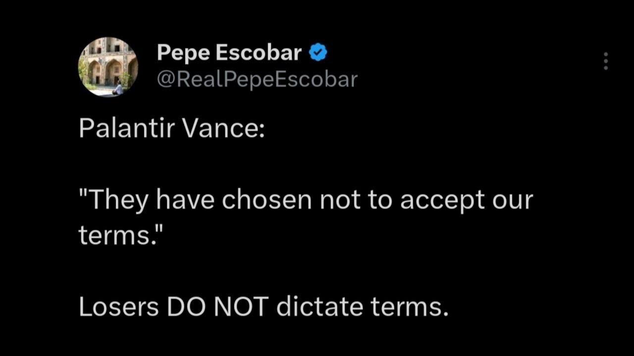 پپه اسکوبار، تحلیلگر برزیلی با کنایه به روند مذاکرات ایران و آمریکا در پیامی نوشت : ونس می‌گوید ایرانی‌ها «تصمیم گرفته‌اند که شرایط ما را نپذیرند.»