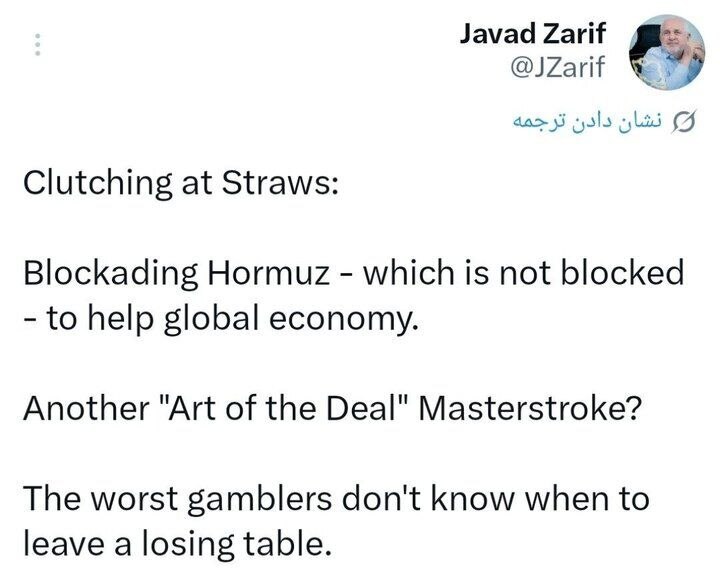 به گزارش نابناک، محمدجواد ظریف وزیر پیشین امور خارجه در واکنش به تهدید ترامپ برای محاصره دریایی ایران در مطلبی در شبکه اجتماعی ایکس نوشت: «الغریق یتشبث بکل حشیش» (کسی که در حال غرق شدن است به هر علفی چنگ می زند).