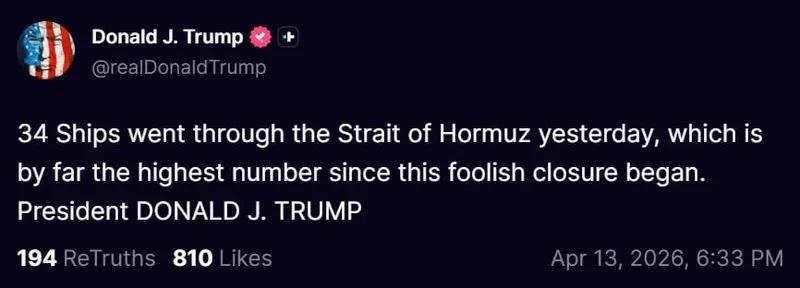 به گزارش تابناک، دونالد ترامپ، رئیس جمهور ایالات متحده، در پیامی در شبکه تروث سوشال مدعی شد: «دیروز ۳۴ کشتی از تنگه هرمز عبور کردند که تاکنون بالاترین تعداد از زمان آغاز این انسداد احمقانه بوده است.»
