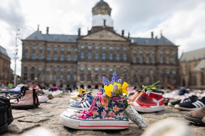 دیروز در میدان دام در آمستردامِ هلند، کفشهایی برای بزرگداشت بیش از ۲۰,۰۰۰ کودکی که در غزه توسط نیروهای اشغالگر کشته شدند، قرار داده شد.