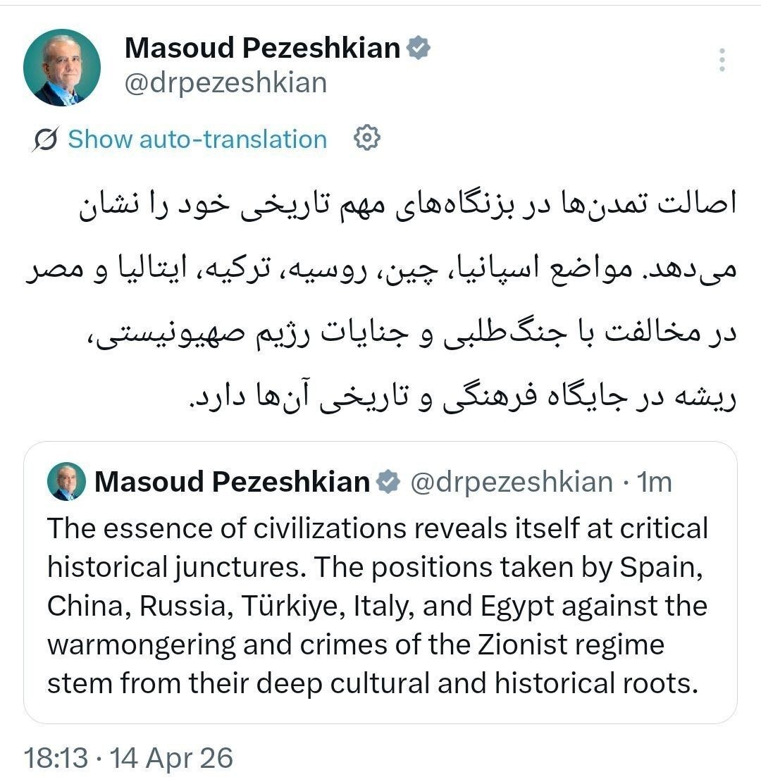 به گزارش تابناک، مسعود پزشکیان، رئیس جمهور در شبکه ایکس نوشت: اصالت تمدنها در بزنگاههای مهم تاریخی خود را نشان میدهد.