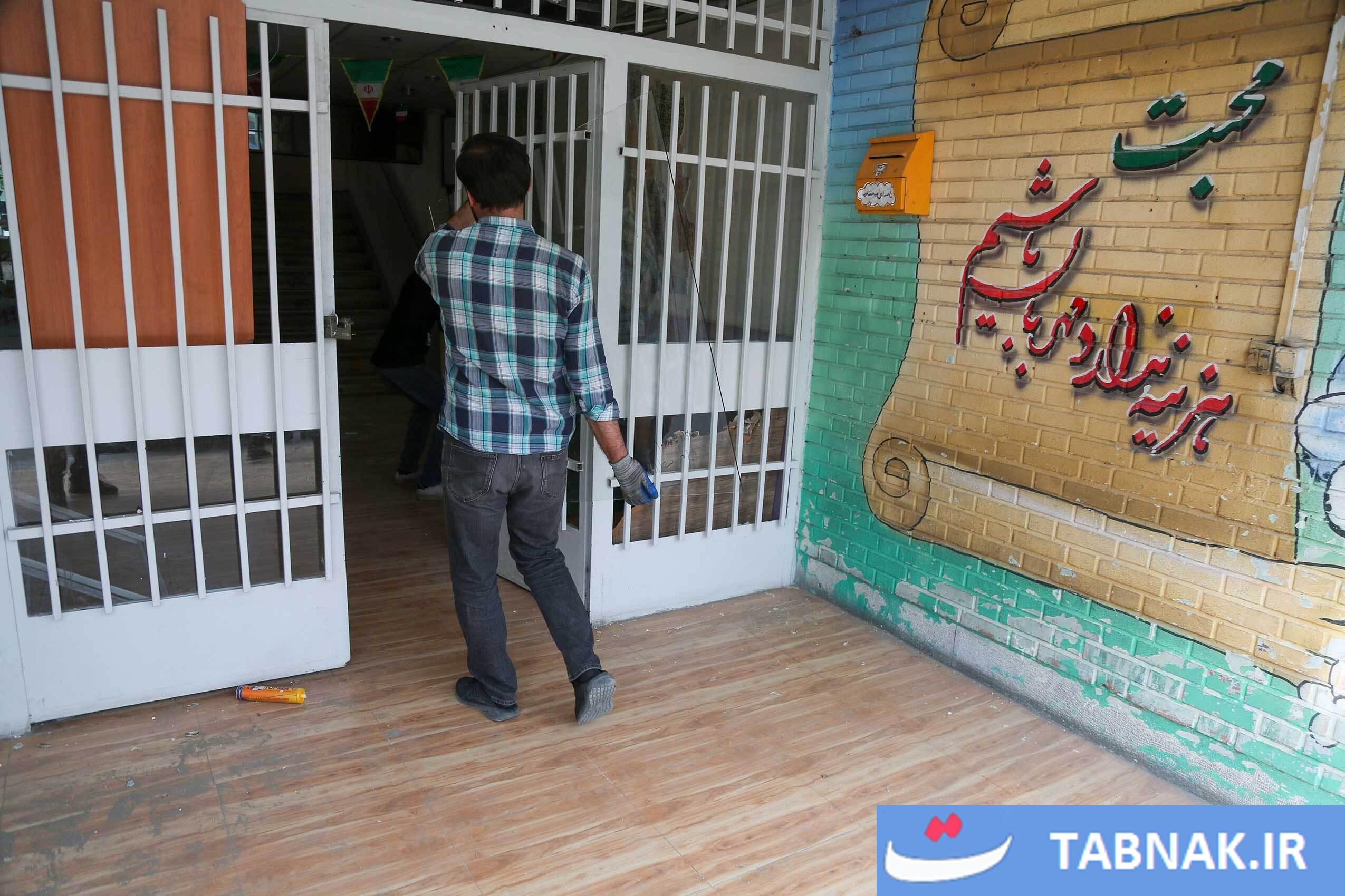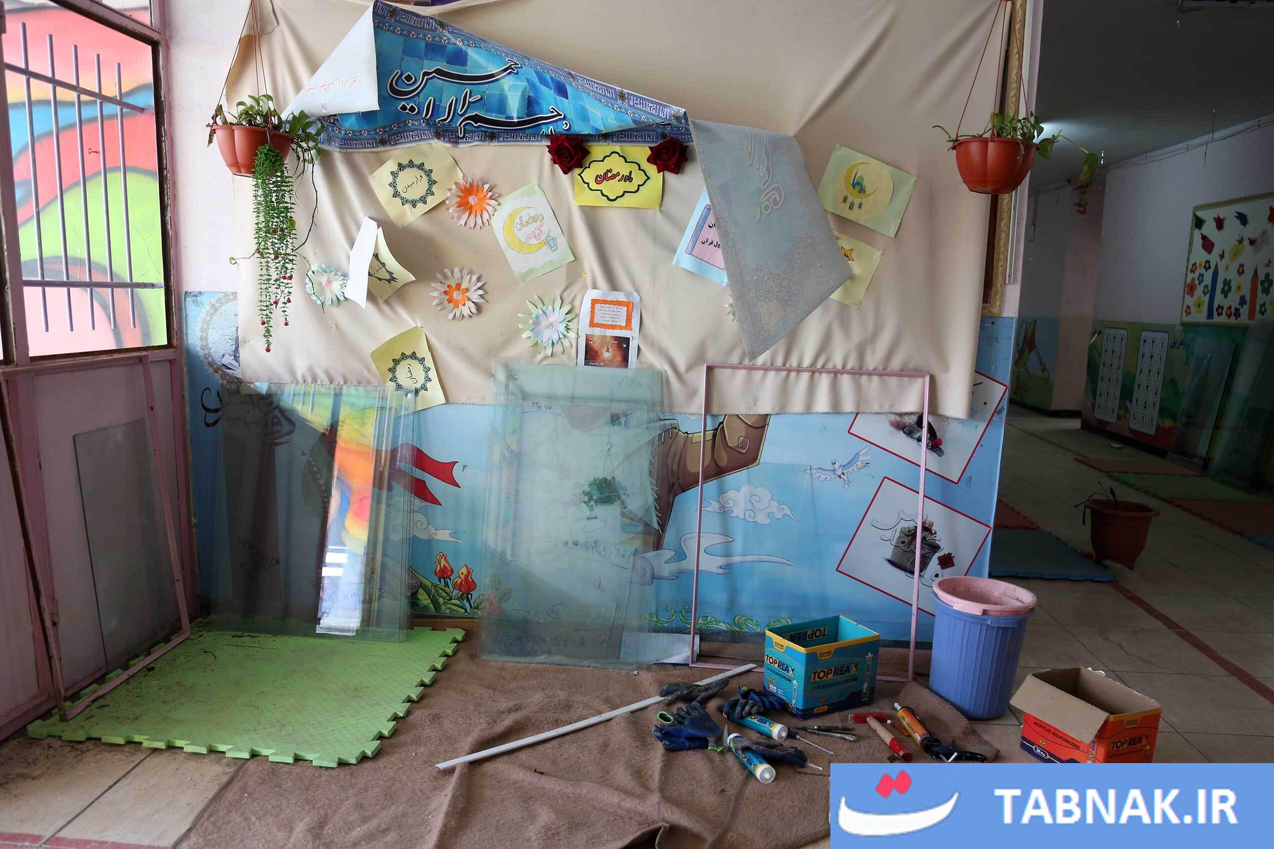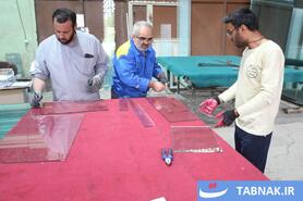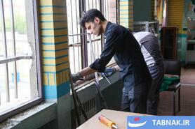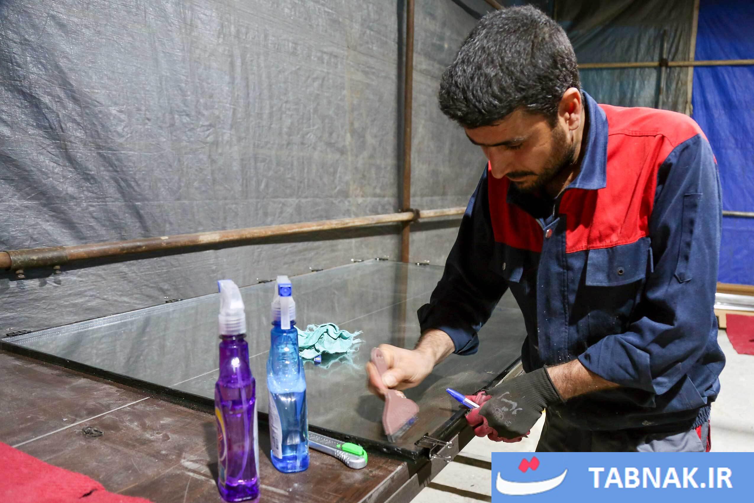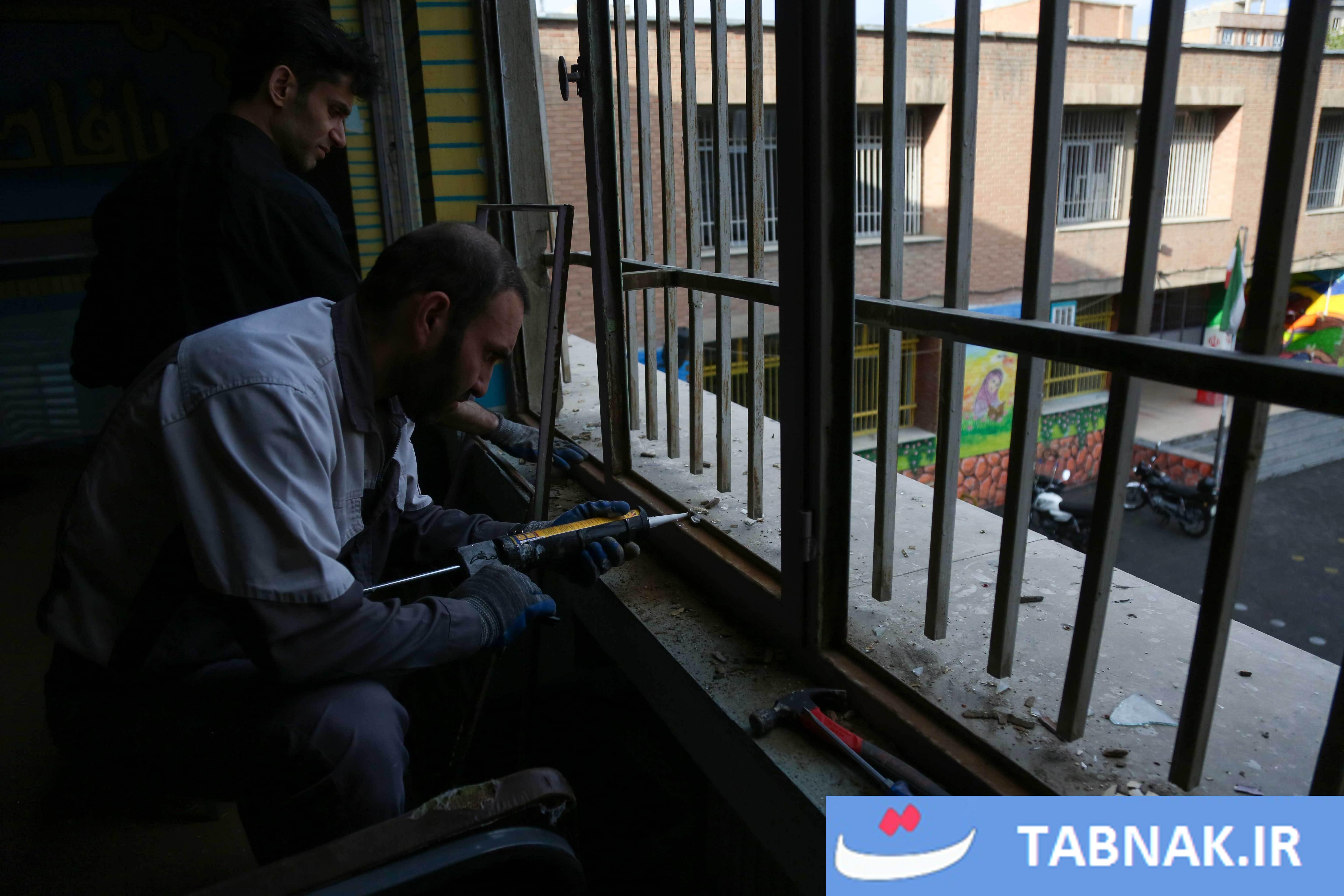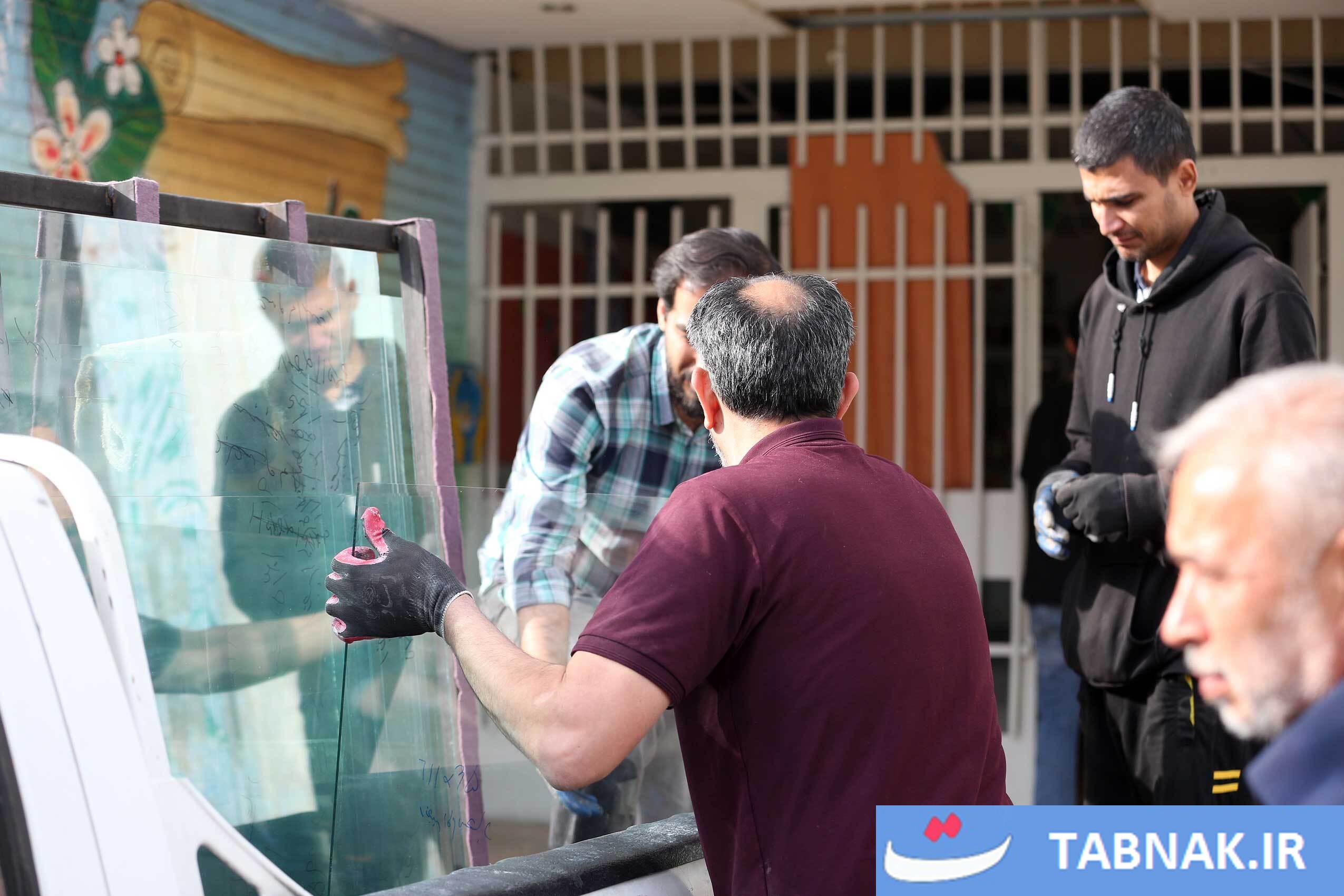 جهادگرانی که در مناطق آسیبدیده از جنگ، شیشههای شکسته مدارس و منازل مسکونی را تعمیر میکنند.