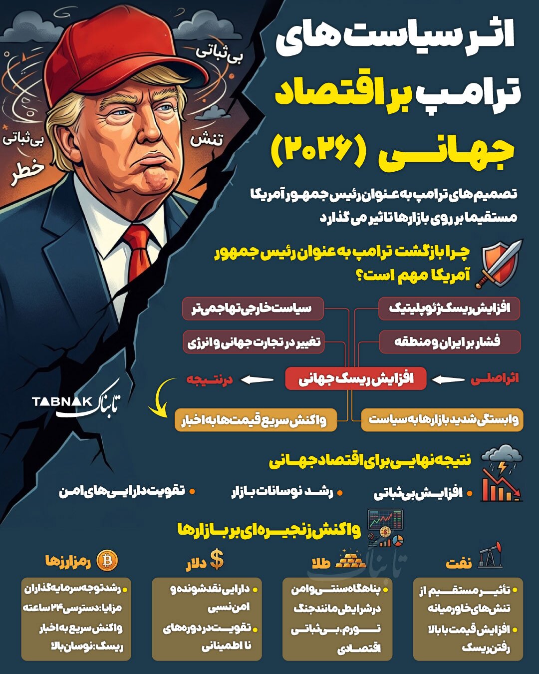 در اینفوگرافیک زیر، تابناک به بررسی اثر سیاستهای ترامپ بر اقتصاد جهان در سال ۲۰۲۶ \رداخته است.
