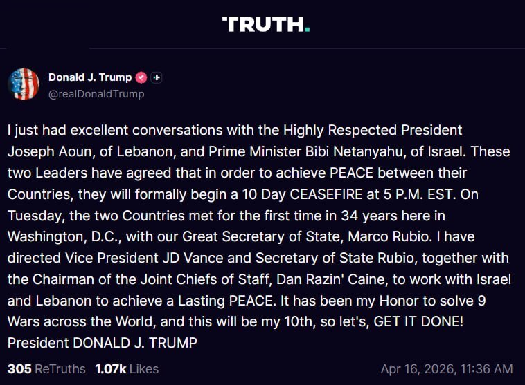 ترامپ افزود که جیدی ونس، معاون وی و مارکو روبیو، وزیر خارجه آمریکا را به همراه رئیس ستاد مشترک ارتش مأمور کرده است تا «برای دستیابی به صلح پایدار میان اسرائیل و لبنان همکاری کنند».