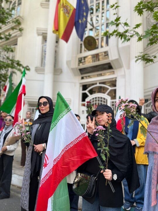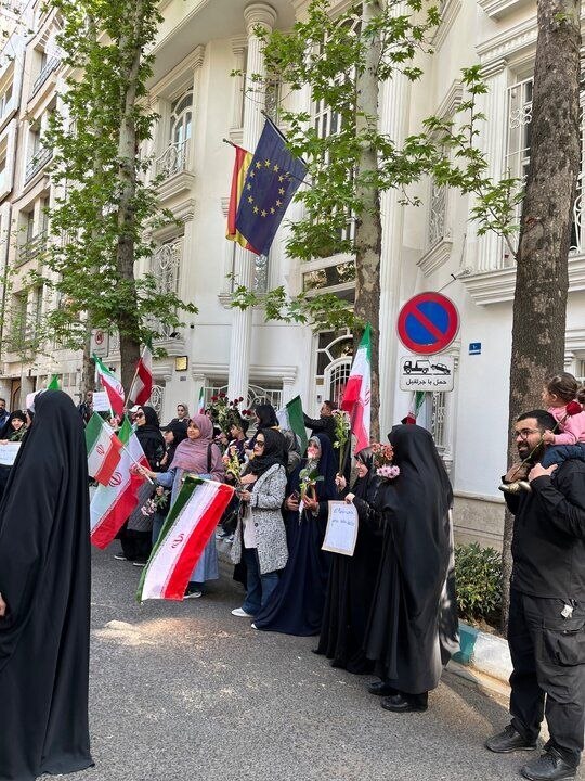 جمعی از شهروندان تهرانی که این روزها در میادین و خیابان های شهر در حمایت از نیروهای مسلح کشور حاضر هستند با تجمع مقابل سفارت اسپانیا از مقامات و مردم این کشور در دفاع از کشورمان و حقانیت دفاع مشروع ایران قدردانی کردند.