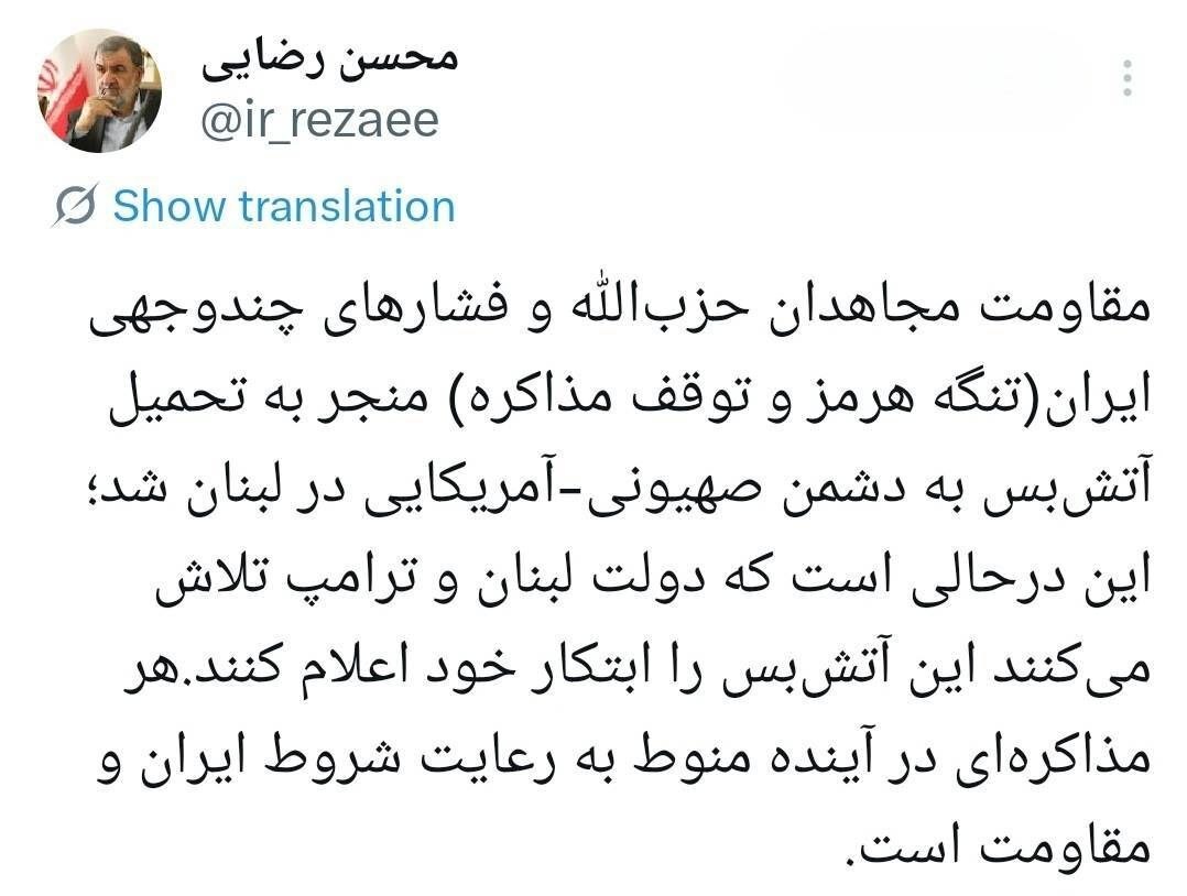 محسن رضایی نوشت: مقاومت مجاهدان جزبالله و تلاش ایران منجر به برقراری آتش بس در لبنان شد.