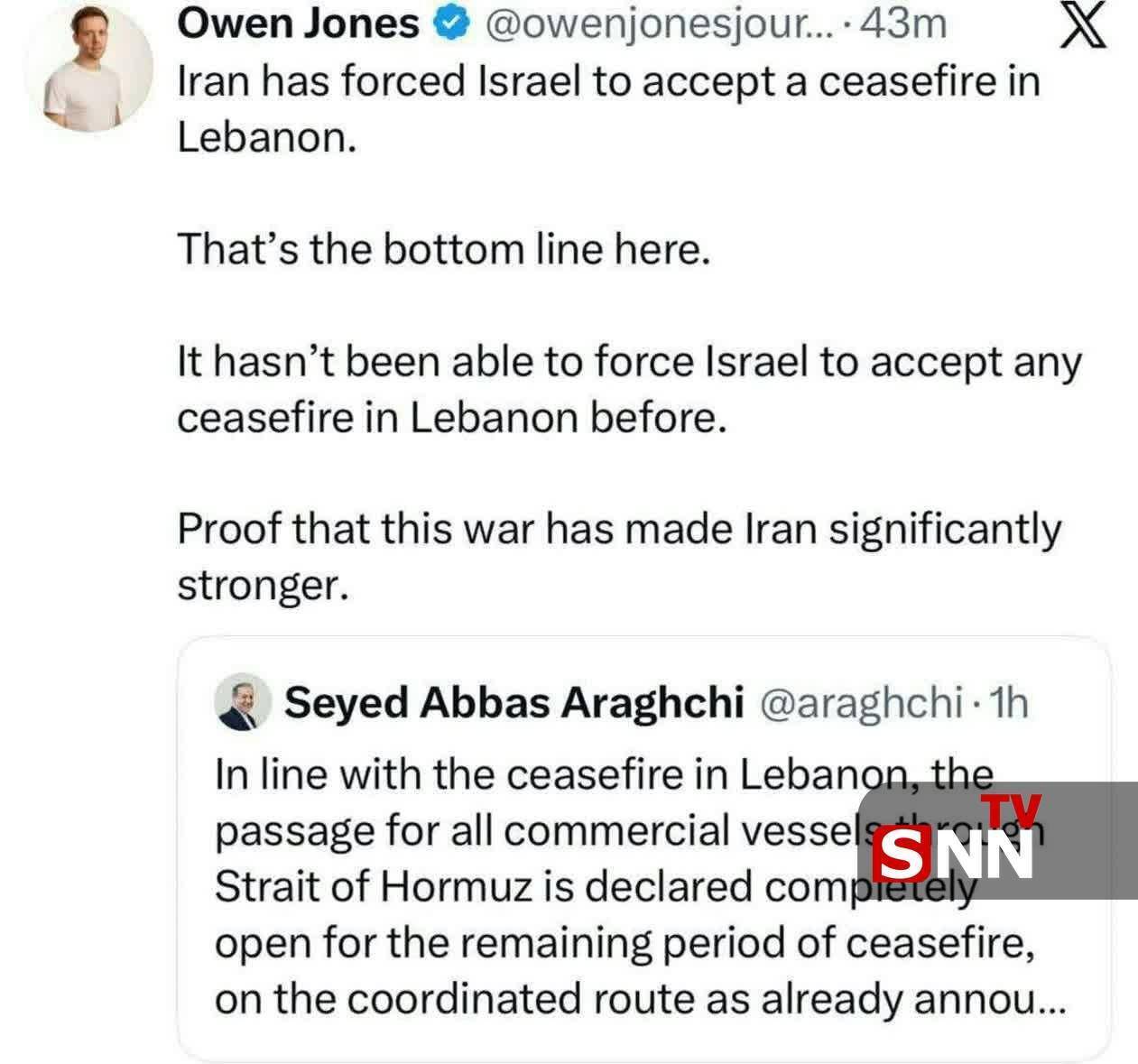 به گزارش تابناک،  جونز، روزنامه‌نگار و نویسنده بریتانیایی در فضای مجازی نوشت: حرف آخر این است که ایران، اسرائیل را مجبور کرد آتش‌بس در لبنان را بپذیرد. وی افزود: پیش از این هرگز چنین فشاری بر اسرائیل کارساز نشده بود؛ این اتفاق ثابت می‌کند که این جنگ، ایران را به‌مراتب قدرتمندتر از قبل کرده است.