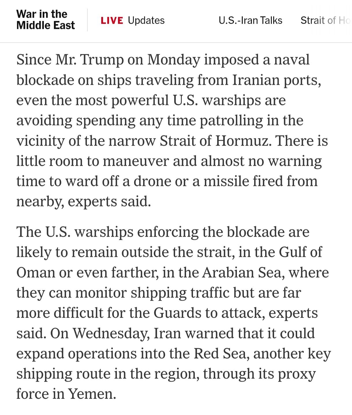 نیویورک تایمز نوشت: از زمانی که ترامپ محاصرهٔ دریایی بنادر ایران را اعمال کرد، حتی قدرتمندترین کشتیهای جنگی آمریکا نیز از گشتزنی در نزدیکی تنگهٔ باریک هرمز اجتناب میکنند.