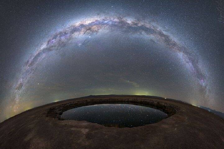 ب️ه گزارش تابناک؛ چشم قابل مشاهده در این عکس در واقع یک تالاب کوچک است و در حالی که کهکشان راه شیری بر فراز آن قوس گرفته، آسمان تاریک شب را منعکس می‌کند.