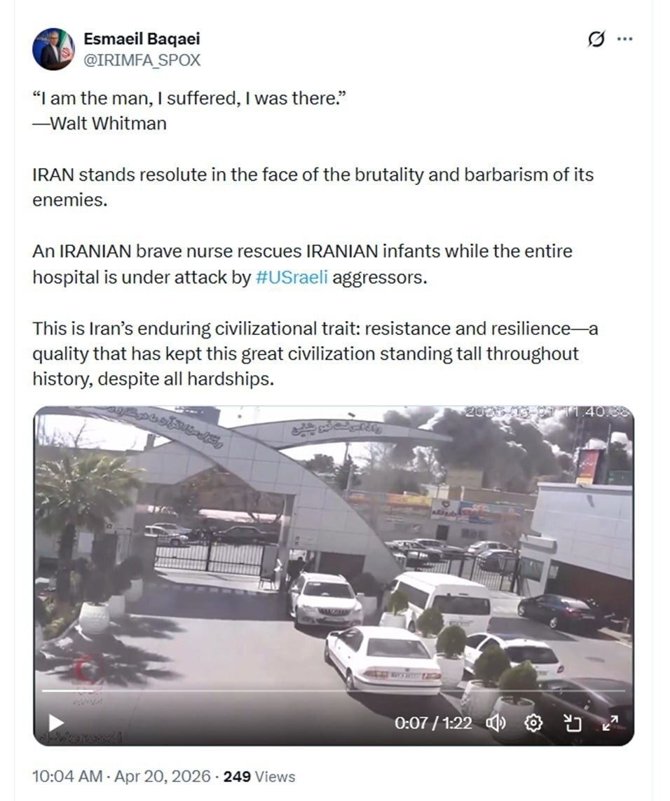 به گزارش تابناک؛ سخنگوی وزارت امور خارجه در پستی نوشته است: من همان انسانم، من رنج کشیدم، من آنجا بودم. (والت ویتمن)