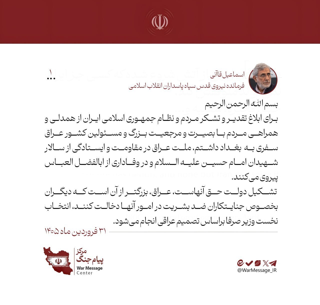 سردار قاآنی: تشکیل دولت حق مردم عراق است و جنایتکاران ضد بشریت نباید در امور آنها دخالت کنند.