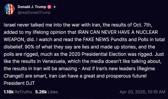 ترامپ همچنین با انتقاد از رسانه‌ها و تحلیلگران، آنها را به انتشار اخبار جعلی متهم کرد و مدعی شد ۹۰ درصد از گفته‌های آنها دروغ یا ساختگی است. او نظرسنجی‌ها را نیز دستکاری‌شده خواند و آنها را با نتایج انتخابات ریاست جمهوری ۲۰۲۰ مقایسه کرد.