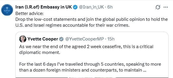 پیشتر ایویت کوپر، وزیر امور خارجه انگلیس بدون توجه به علت اصلی ناامنی در تنگه هرمز نوشته بود: در شش روز گذشته، من به ۵ کشور سفر کردهام و با بیش از دوازده وزیر امور خارجه صحبت کردهام تا فشار بینالمللی را برای باز کردن تنگه هرمز حفظ کنم.