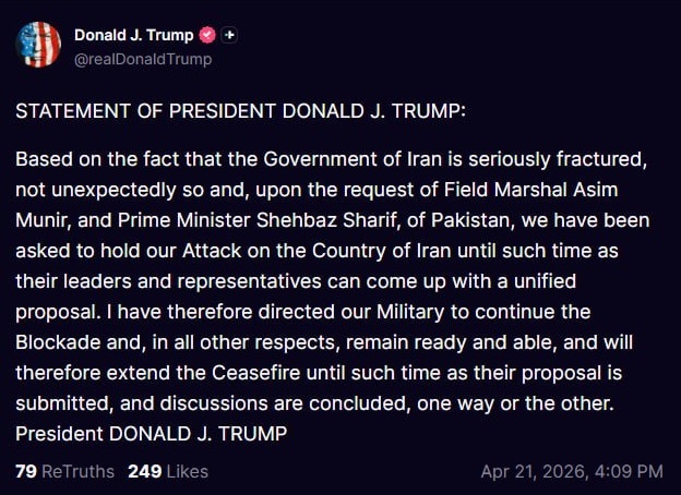 دونالد ترامپ رئیس جمهور آمریکا با انتشار پستی اعلام کرد که آتشبس را تمدید میکند.