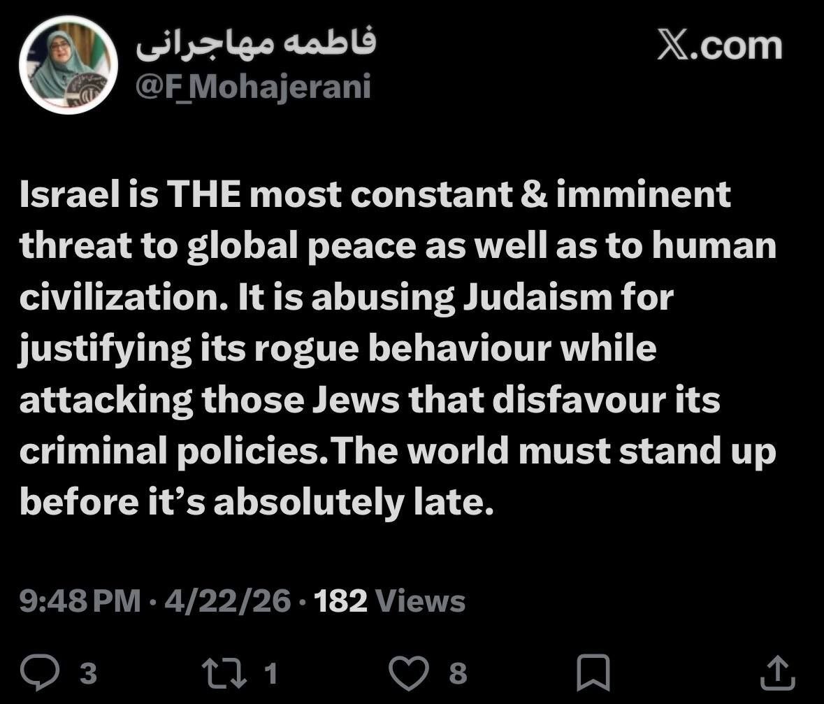 به گزارش تابناک، فاطمه مهاجرانی در حساب کاربری خود در شبکه اجتماعی ایکس به انگلیسی نوشت: