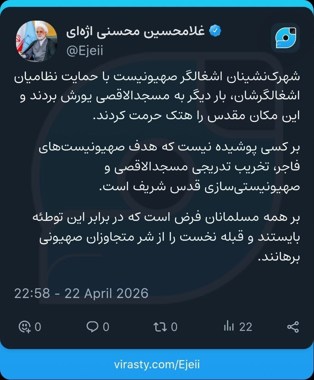 به گزارش تابناک، غلامحسین محسنی اژهای، رئیس قوه قضائیه در شبکه اجتماعی ویراستی با هشدار نسبت به اقدامات رژیم صهیونیستی نوشت: هدف صهیونیستها تخریب و صهیونیستیسازی تدریجی قدس شریف است. بر همه مسلمانان فرض است در مقابل این توطئه بایستند.