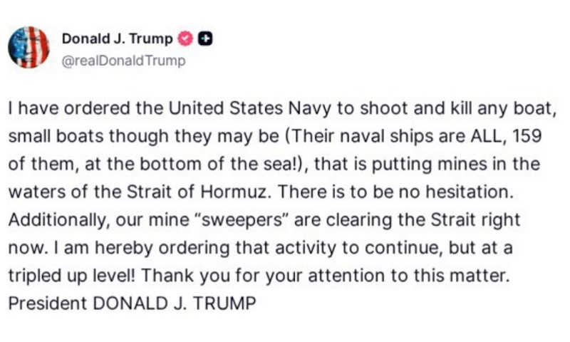 ترامپ افزود: نباید تردیدی کرد. علاوه بر این، «مین‌روب‌های» ما همین الان در حال پاکسازی تنگه هستند. من بدینوسیله دستور می‌دهم که این فعالیت ادامه یابد، اما در سطحی سه برابر!