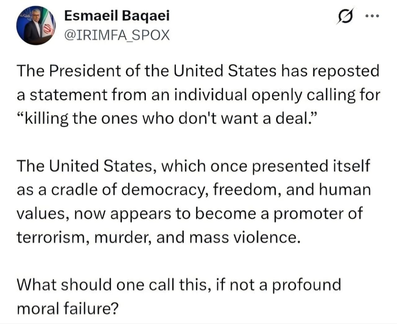 به گزارش تابناک، اسماعیل بقائی در واکنش به تکرار اظهارات مقامهای آمریکایی در ترغیب به ترور ایرانیان، در شبکه ایکس نوشت: «رییس جمهور آمریکا قول کسی را منتشر کرده که توصیه به ترور - از نظر او - مخالفان توافق کرده است. آمریکا که زمانی خود را مهد دموکراسی، آزادی و ارزشهای انسانی معرفی میکرد، اکنون آشکارا به مروج تروریسم و خشونت و کشتار جمعی تبدیل شده است!
