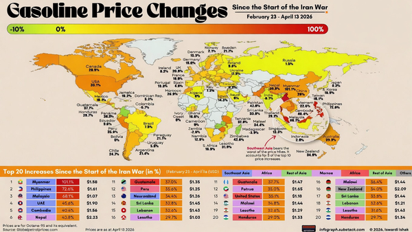 بر اساس داده‌های آماری استخراج شده از نقشه جهانی قیمت سوخت در بازه زمانی ۲۳ فوریه تا ۱۳ آوریل ۲۰۲۶، بازار انرژی با یکی از شدیدترین شوک‌های قیمتی خود روبرو شده است.