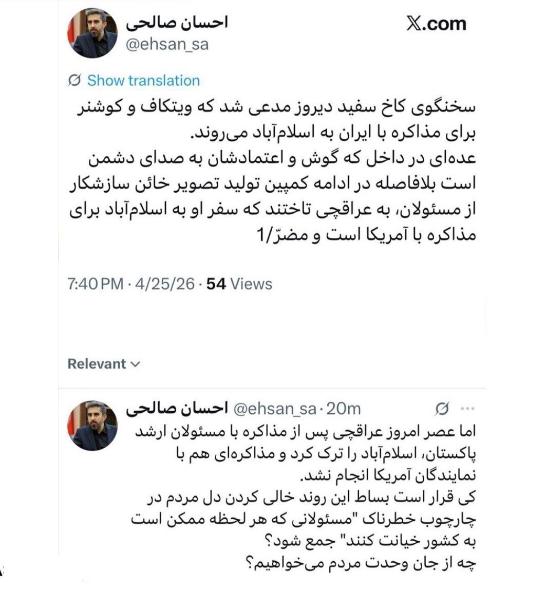به گزارش تابناک، «احسان صالحی» تحلیلگر سیاسی خطاب به منتقدان سفر عراقچی به اسلامآباد در شبکه اجتماعی ایکس نوشت:
