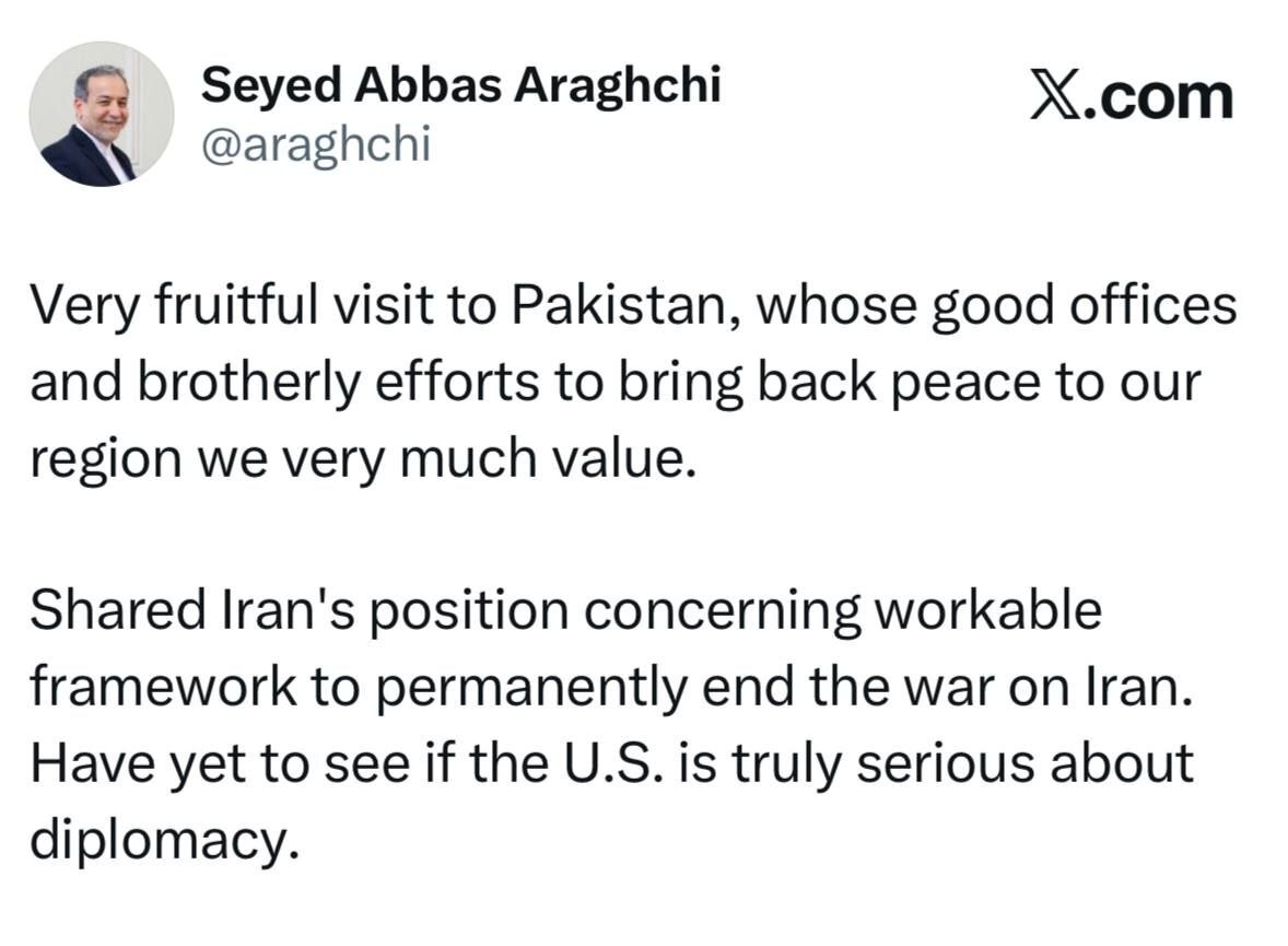 در این سفر، موضع جمهوری اسلامی ایران را درباره یک چارچوب عملی و قابل اجرا برای پایان دائمی جنگ علیه ایران تشریح کردم. باید دید آیا ایالات متحده واقعاً از ارادهای جدی برای پیشبرد دیپلماسی برخوردار است؟