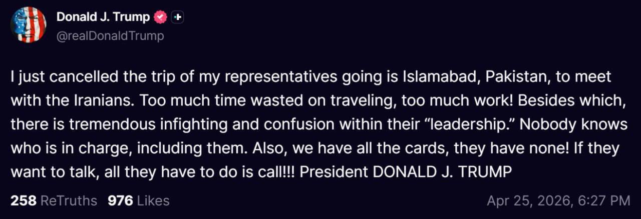 گفتنی است پس از چند روز بازی ترامپ و رسانههای آمریکایی درباره سفر آمریکایی ها به اسلامآباد برای مذاکره، با پایان یافتن سفر عراقچی مشخص شد کاملاً کذب است.