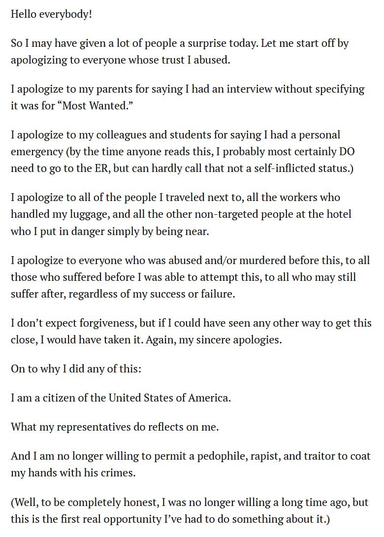 ضارب ضیافت خبرنگاران کاخ سفید بیانیه‌ای را پیش از حمله نوشته و گفته که دیگر حاضر نیست به «یک کودک‌آزار، متجاوز و خائن» اجازه دهد که دست او را در جنایات خود آلوده کند.